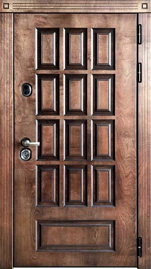 Хорошие атмосферостойкие свойства корабельной фанеры позволяют использовать ее для отделки металлических дверей. Внешне корабельная фанера ничуть не уступает накладкам из массива, но, в отличии от них, более легкая, долговечная, устойчива к перепадам влажности и температуры, не рассыхается, менее подвержена деформации и не имеет так называемого «эффекта памяти», то есть, в отличии от накладок из массива, не старается «вернуться» в исходное положение. По стоимости двери из корабельной фанеры находятся в одном ценовом диапазоне с дверями, сделанными с использованием массива. Ввиду высокой плотности материала, фрезеровка выполняется специальными фрезами, что дает возможность изготовить дверь под любой интерьер и по любому эскизу. А вот вручную нанести фрезеровку на корабельную фанеру не получится – таковы особенности этого материала.
