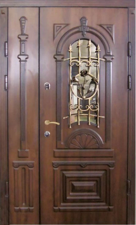 Поскольку в большинстве случаев устанавливаемые на входе в коттедж двустворчатые двери являются еще и предметом интерьера, украшающим здание, их дизайну предается особое значение. Эти двери, как правило, отделываются атмосферостойким МДФ, натуральным шпоном, массивом. Эффектно на таких дверях смотрится витражный узор, применение ковки, зеркальных элементов. Вариантов декора входной двустворчатой двери масса, тут все зависит от пожеланий заказчика.