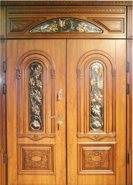 Поскольку в большинстве случаев устанавливаемые на входе в коттедж двустворчатые двери являются еще и предметом интерьера, украшающим здание, их дизайну предается особое значение. Эти двери, как правило, отделываются атмосферостойким МДФ, натуральным шпоном, массивом. Эффектно на таких дверях смотрится витражный узор, применение ковки, зеркальных элементов. Вариантов декора входной двустворчатой двери масса, тут все зависит от пожеланий заказчика.